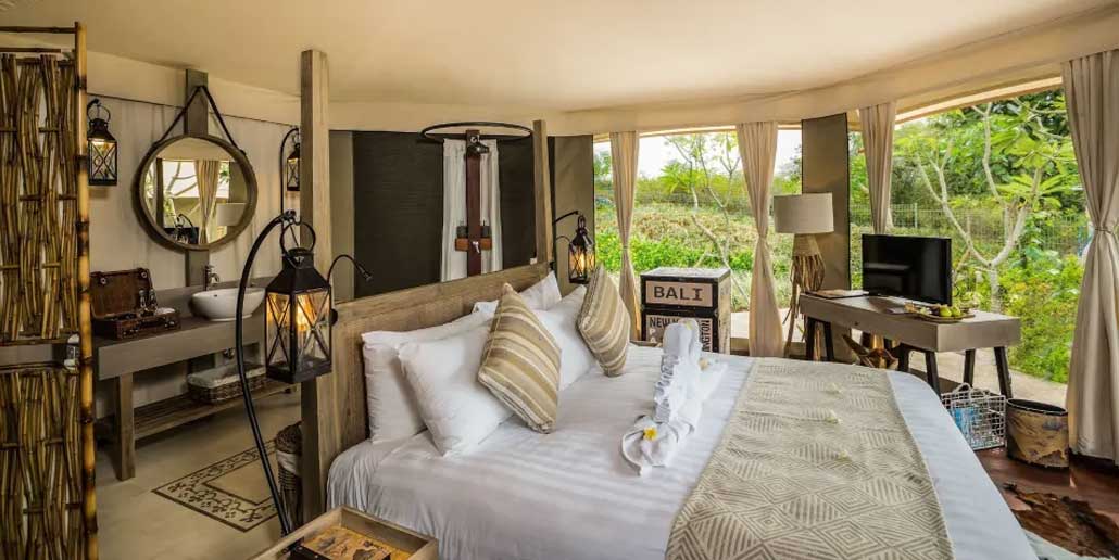 The safari-style tented rooms and villas, combined with a series of magnificent communal spaces crafted in bamboo and ‘alang-alang’ thatch, present a refreshing alternative in architectural style and five-star flair. Delicious cuisine, with the glamping Resort’s signature Pasir Putih Beach Club & Bar offering all-day dining, as well as the opportunity for romantic dinners in the setting of your choice, can all be enjoyed, supported by excellent service from a team of safari-suited staff.
